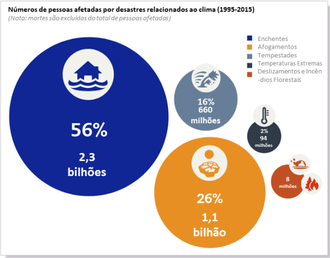 O documento da ONU, Custo Humano de Desastres Relacionados ao Clima (Human Cost of Weather Relates Disasters), que cobre o período de 1995-2015, mostra no total 6,457 desastres relacionados ao clima registrados no mundo entre estas datas. Estes eventos ceifaram aproximadamente 606 mil vidas, uma média de 30 mil por ano, com um adicional de 4,1 bilhões de pessoas feridas, que precisaram de assistência de emergência ou que perderam suas casas.