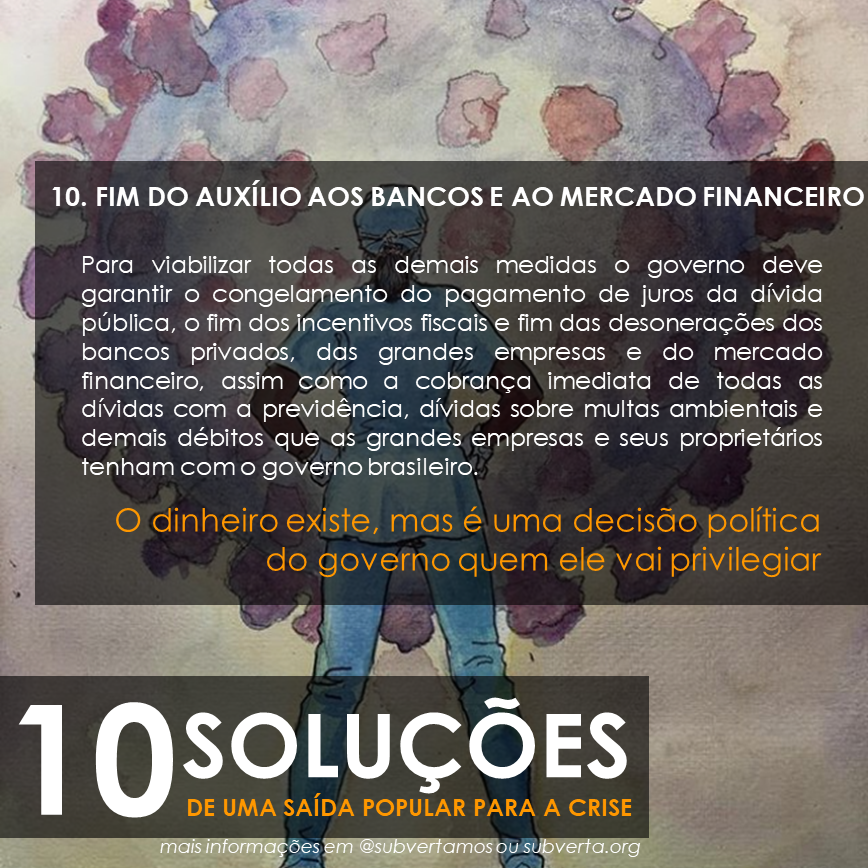 Para viabilizar todas as demais medidas o governo deve garantir o congelamento do pagamento de juros da dívida pública, o fim dos incentivos fiscais e fim das desonerações dos bancos privados, das grandes empresas e do mercado financeiro, assim como a cobrança imediata de todas as dívidas com a previdência, dívidas sobre multas ambientais e demais débitos que as grandes empresas e seus proprietários tenham com o governo brasileiro.