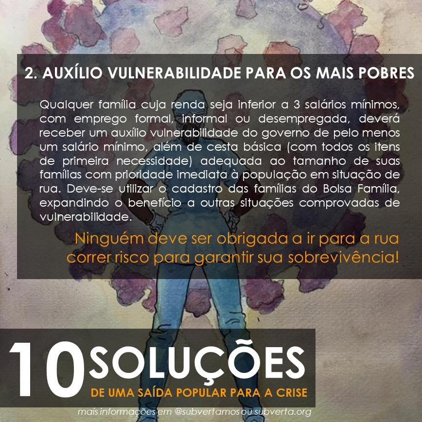 Qualquer família cuja renda seja inferior a 3 salários mínimos, com emprego formal, informal ou desempregada, deverá receber um auxílio vulnerabilidade do governo de pelo menos um salário mínimo, além de cesta básica (com todos os itens de primeira necessidade) adequada ao tamanho de suas famílias com prioridade imediata à população em situação de rua. Deve-se utilizar o cadastro das famílias do Bolsa Família, expandindo o benefício a outras situações comprovadas de vulnerabilidade.