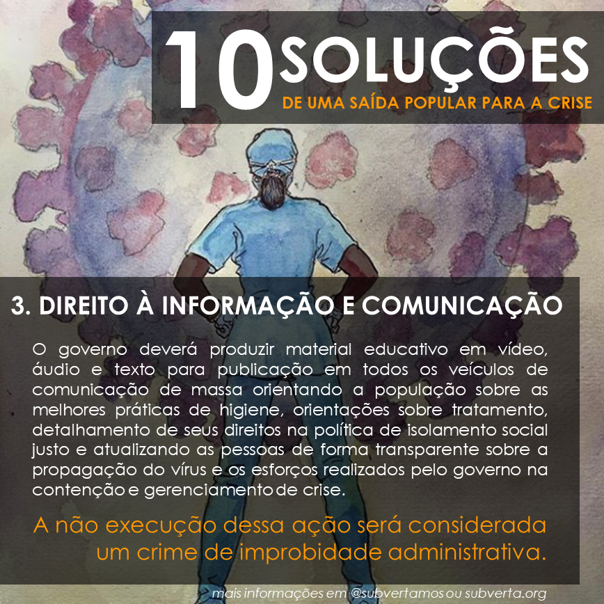 O governo deverá produzir material educativo em vídeo, áudio e texto para publicação em todos os veículos de comunicação de massa orientando a população sobre as melhores práticas de higiene, orientações sobre tratamento, detalhamento de seus direitos na política de isolamento social justo e atualizando as pessoas de forma transparente sobre a propagação do vírus e os esforços realizados pelo governo na contenção e gerenciamento de crise.