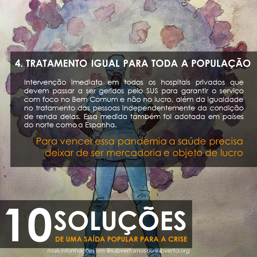 Intervenção imediata em todos os hospitais privados que devem passar a ser geridos pelo SUS para garantir o serviço com foco no Bem Comum e não no lucro, além da igualdade no tratamento das pessoas independentemente da condição de renda delas (medida adotada também na Espanha).
