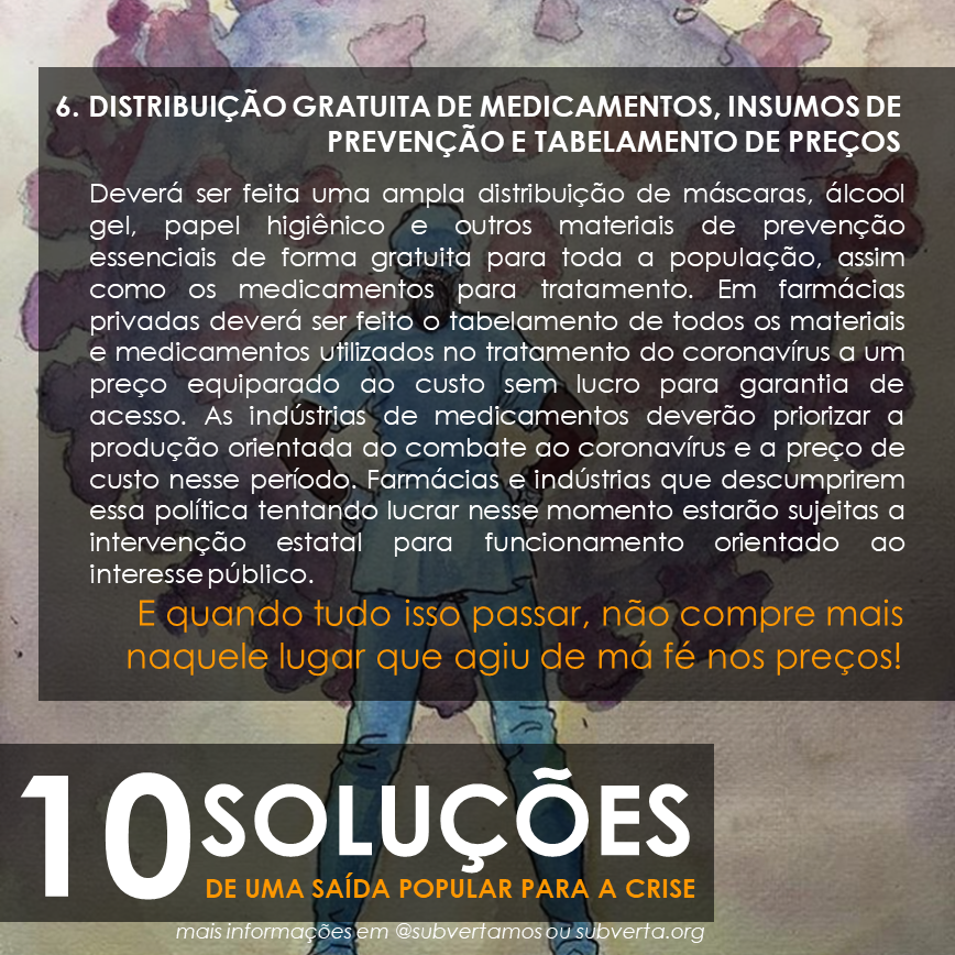 Deverá ser feita uma ampla distribuição de máscaras, álcool gel, papel higiênico e outros materiais de prevenção essenciais de forma gratuita para toda a população, assim como os medicamentos para tratamento. Em farmácias privadas deverá ser feito o tabelamento de todos os materiais e medicamentos utilizados no tratamento do coronavírus a um preço equiparado ao custo sem lucro para garantia de acesso. As indústrias de medicamentos deverão priorizar a produção orientada ao combate ao coronavírus e a preço de custo nesse período. Farmácias e indústrias que descumprirem essa política tentando lucrar nesse momento estarão sujeitas a intervenção estatal para funcionamento orientado ao interesse público.