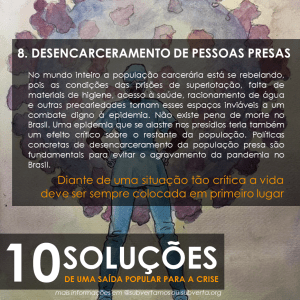 No mundo inteiro a população carcerária está se rebelando, pois as condições das prisões de superlotação, falta de materiais de higiene, acesso à saúde, racionamento de água e outras precariedades tornam esses espaços inviáveis a um combate digno à epidemia. Não existe pena de morte no Brasil. Uma epidemia que se alastre nos presídios teria também um efeito crítico sobre o restante da população. Políticas concretas de desencarceramento da população presa são fundamentais para evitar o agravamento da pandemia no Brasil.