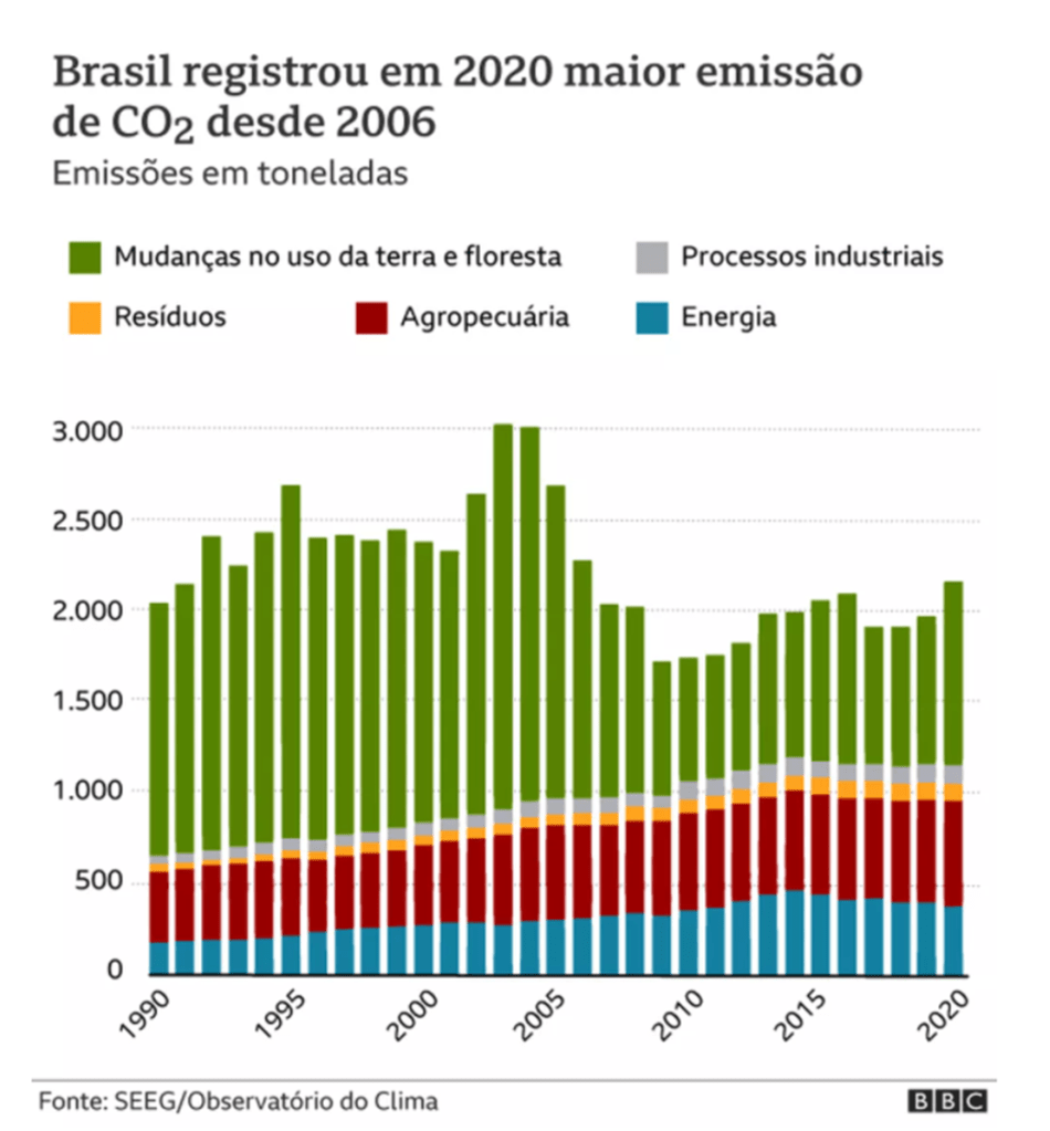 Esse aumento é percebido no gráfico a seguir e fica nítida a razão: o aumento da contribuição da “mudança no uso da terra e floresta”, mais conhecida como desmatamento.